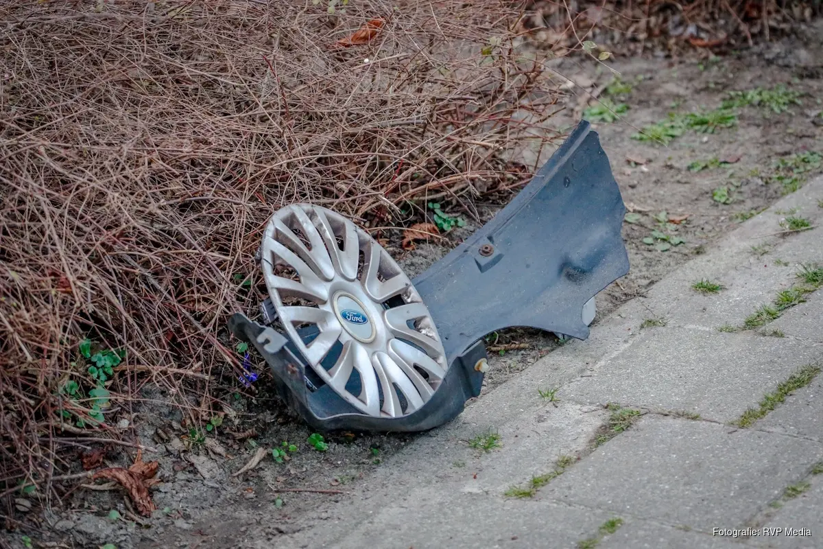 De politie vraagt de bestuurder van de rode Ford zich te melden. De auto heeft vermoedelijk aanzienlijke schade aan de voorkant en mist waarschijnlijk minimaal één wieldop.