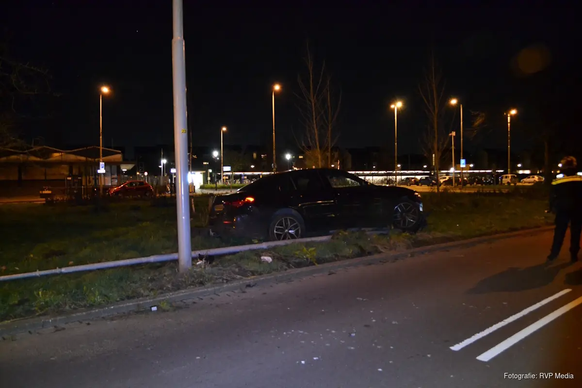 Een automobilist verloor in een bocht de macht over het stuur en botste tegen een lantaarnpaal aan de zijkant van de weg. De auto kwam vervolgens in het gras tot stilstand.