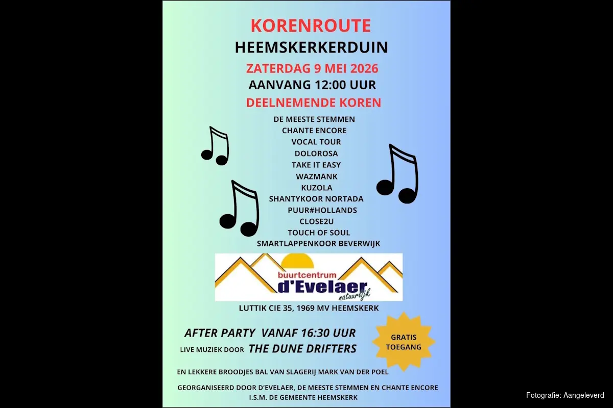 HEEMSKERK - De toegang is geheel gratis voor het luisterend publiek. . de Korenroute wordt georganiseerd door het Chante Encore en De Meeste Stemmen in samenwerking met Buurtcentrum d'Evelaer.